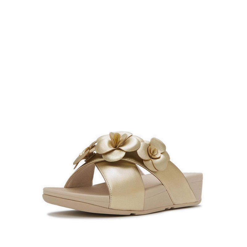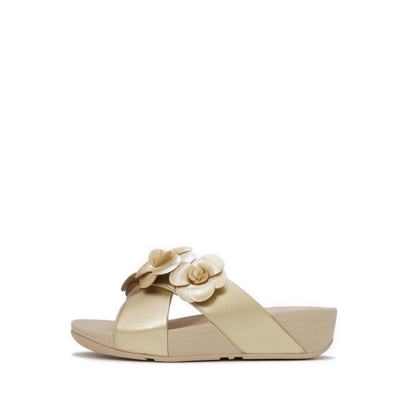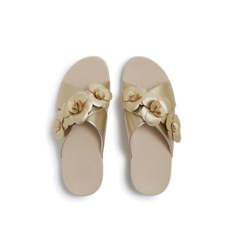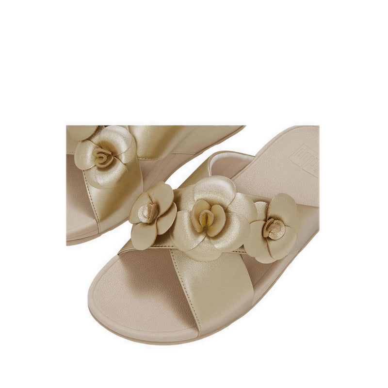 Smooth, metallic faux-leather crafts the two crossover front straps of this pair, creating a cocooning silhouette that hugs your foot for added security. Each strap is fully lined in tactile microfibre on the interior to sit comfortably against your skin, while on the outside, two blooming floral embellishments are crafted from soft leather.