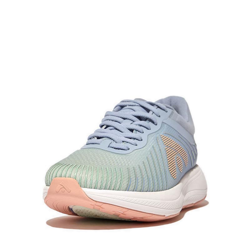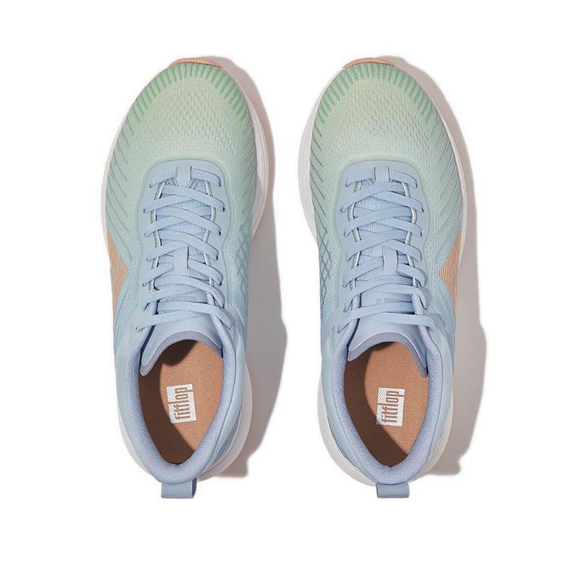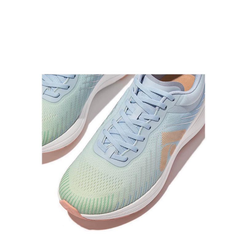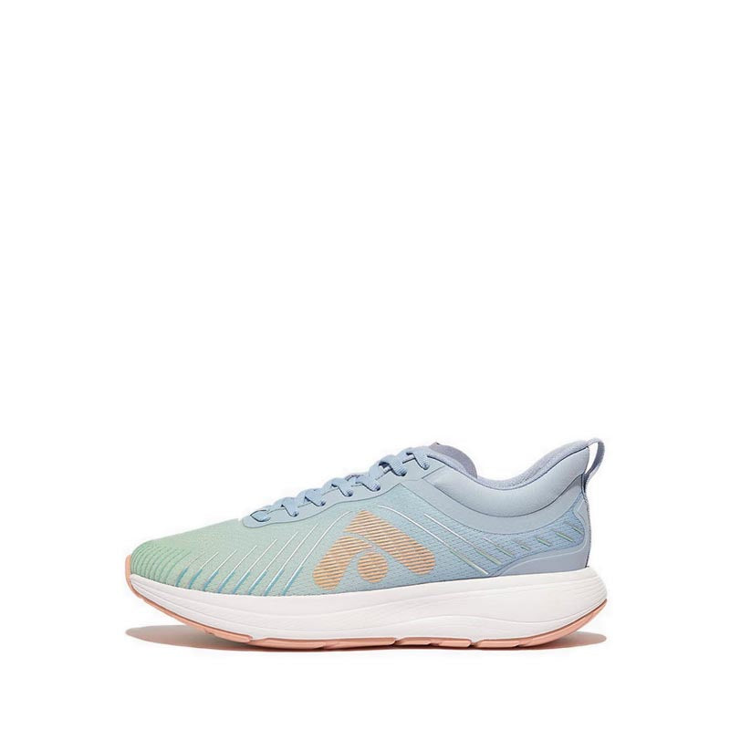 It's free, feels great, and facilitates your physical and mental wellbeing...running is all kinds of awesome. So we set out to create the world's most comfortable running and exercise shoe – this elevated edition with ombré colours and temperature-regulating tech. Biomechanically optimized for endurance running, eg suitable for 10K (but also for sports/gym or just upping everyday activity). Ultra light. High performance. Crafted in a soft stretchy ombré mesh, engineered for high breathability at the vamp/toe and extra support at the sides/arch. 3D-printed details, also ombré, add to the aesthetics. Padded on the collar/tongue. With easy foot entry thanks to a separate tongue/classic lacing, which also ensure the customized fit and security needed for running. All on our new Super Neodynamic™ midsole, a 'performance' version of our carbon-plate tech. Lighter. Even springier – its innovative wishbone-shaped carbon plate gives multi-directional propulsion, working with how the foot naturally moves (side to side as well as forward/back). More cushioned, in the highest-rebound impact-reducing EVA we've ever used. With an enhanced toe spring/heel kick for a smoother 'ride'. In a flexible yet stable women's-specific design, maximising comfort and running efficiency (so you use less energy and can keep going longer). If our FF Runner doesn't get you running, nothing will. Note: These are engineered for a woman's anatomy/gait, not just a sized-down men's running shoe. Other features: • Thermo-lining avoids overheating during activity to reduce perspiration, blisters, odour • Superlight flexible knitted tongue • Anatomically contoured footbed for superb arch support & pressure diffusion • Sole flares out at forefoot & heel to increase stability • Light rubber outsole pods with extra grip & wear resistance for endurance running (grip suited to country paths/light trails) • Outsole also has flex grooves to help feet move naturally & channels to reduce aquaplaning • Contrast-colour 'wishbone' carbon plate visible on bottom of trainer • PU hotmelt & 3D-printed TPU detail (inc. reflective silver 'lines' for when it's darker)