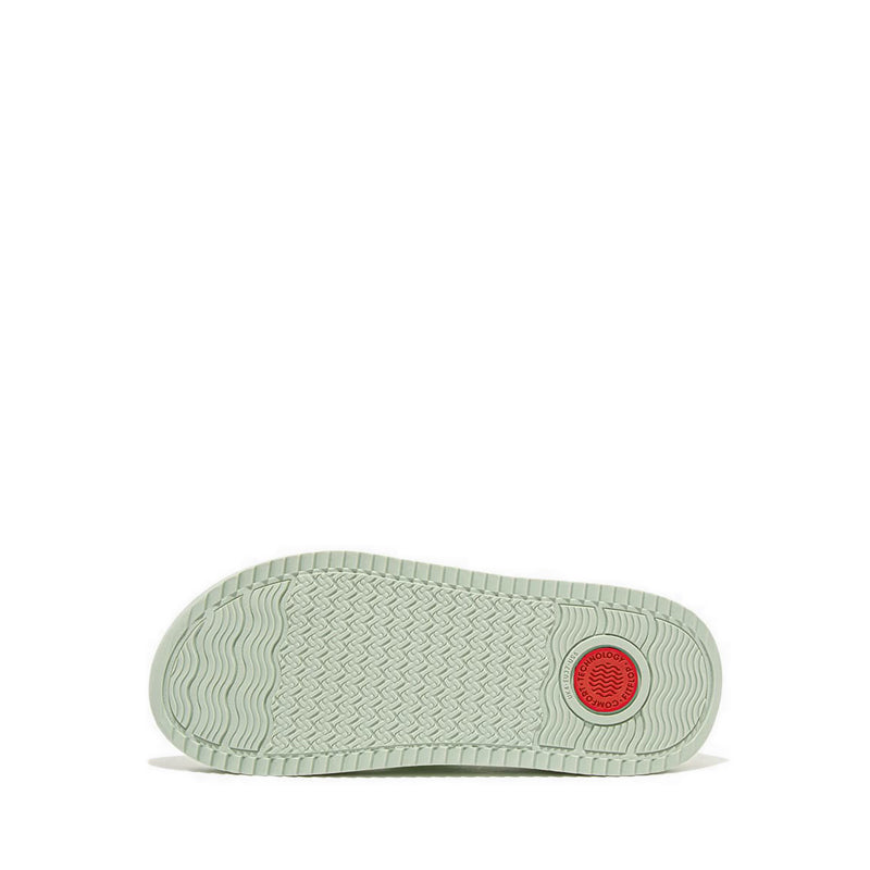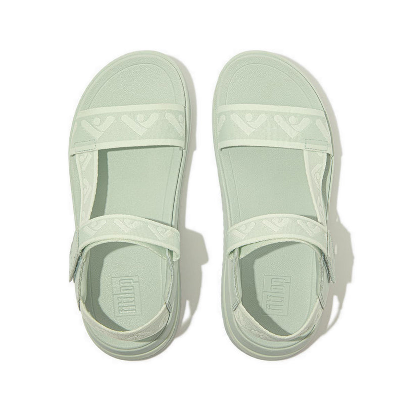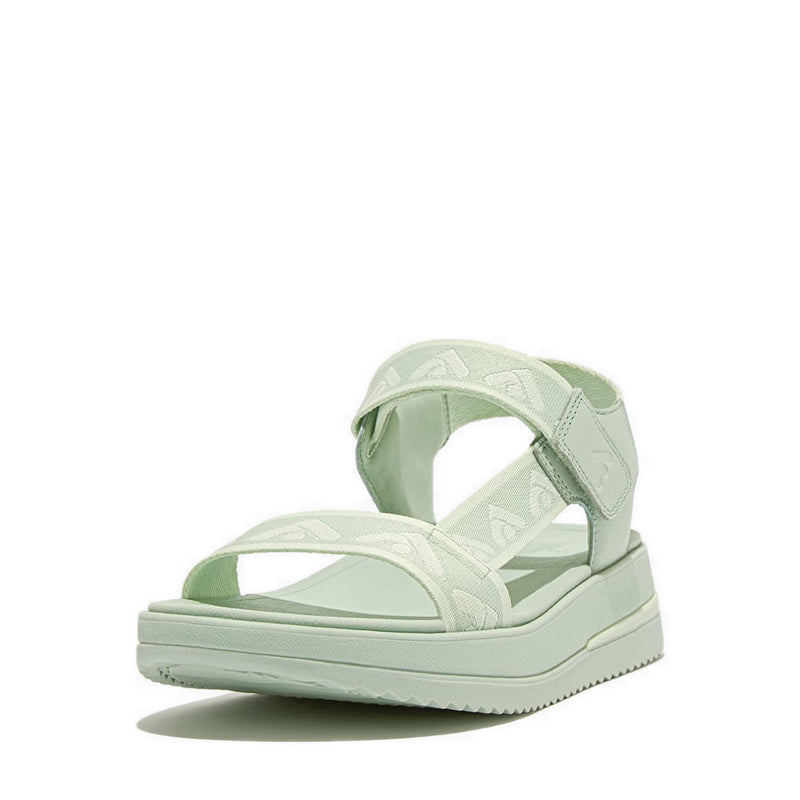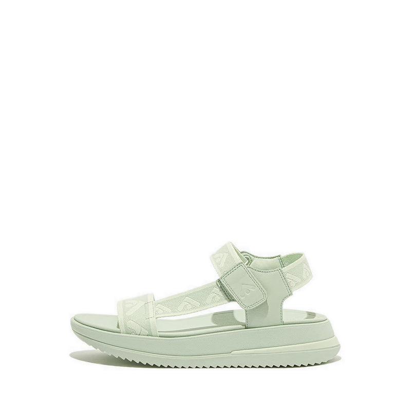 Sporty style elevated to a new level. FitFlop's next-generation athleisure sandals fuse a refined modern aesthetic with its never-bettered original technology. Boasting a utilitarian chunky-sole silhouette, clean lines, and wide foot-hugging straps. Here crafted from soft recycled webbing, featuring the FitFlop 'arrow' as a repeat pattern, in a palette of summery pastel shades. With leather detailing and an adjustable hook-and-loop back strap for easy on/off. On a fresh sporty-look version of FitFlop's supercushioning Microwobbleboard™ midsole. (In a new design, but keeping the classic wide fit and triple-density tech that works with the way you walk for amazing underfoot comfort.) Underneath, a ridged rubber outsole enhances the grip, making these suited for light country trails as well as the beach, on holiday, around the city, to-and-from the gym. Light. Easy. Ergonomically brilliant. Every day you'll put them on first and take them off last.