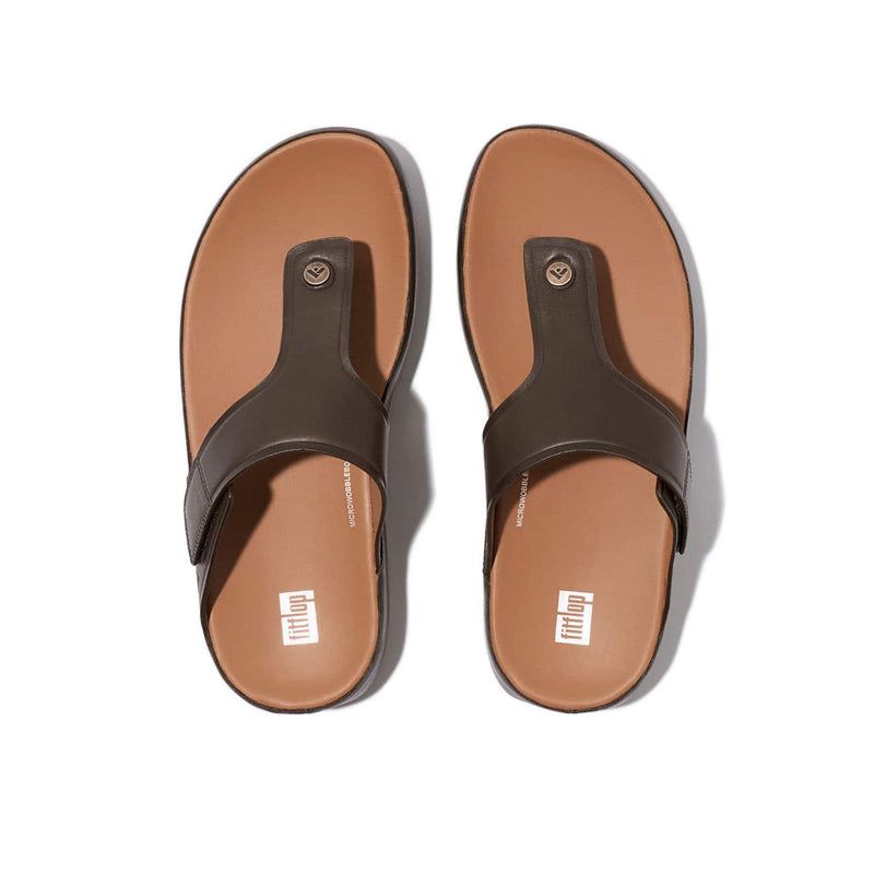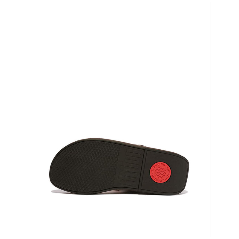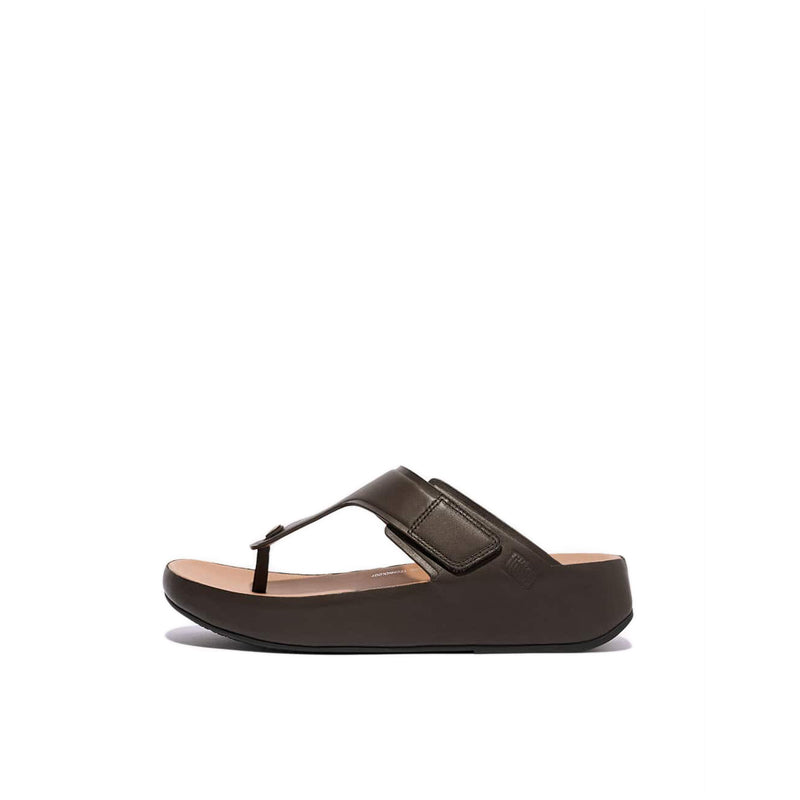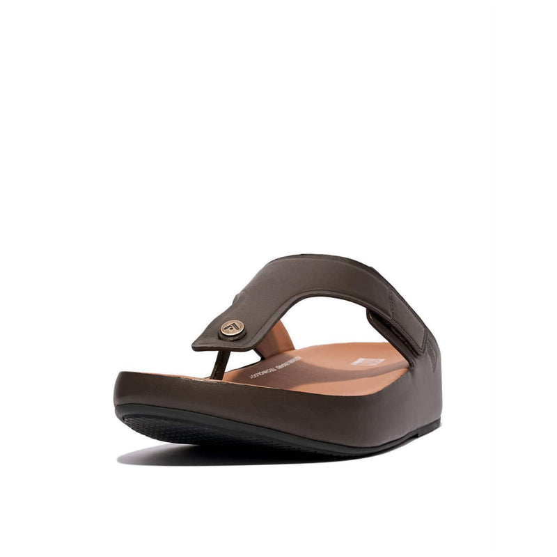 Raise your sandal game with this refined toe-post pair. Sleek. Understated. This version boasting a touch strap for adjustability, ease, and a clean finish. Crafted in smooth, raw-edged, high-quality leather. With debossed edges and logos, double-row stitching, and a brushed-brass 'button' at the front, for subtle detail. Soft leather linings/toe posts and leather-wrapped soles enhance the luxe feel. The comfort's on another level too – thanks to FitFlop's triple-density Microwobbleboard™ midsoles delivering pressure diffusion, impact reduction and non-stop cushioning. Slide on to elevate almost any warm-weather outfit: in the city, weekend jaunts, on holiday... (Note: the brass 'button' is recycled metal.)