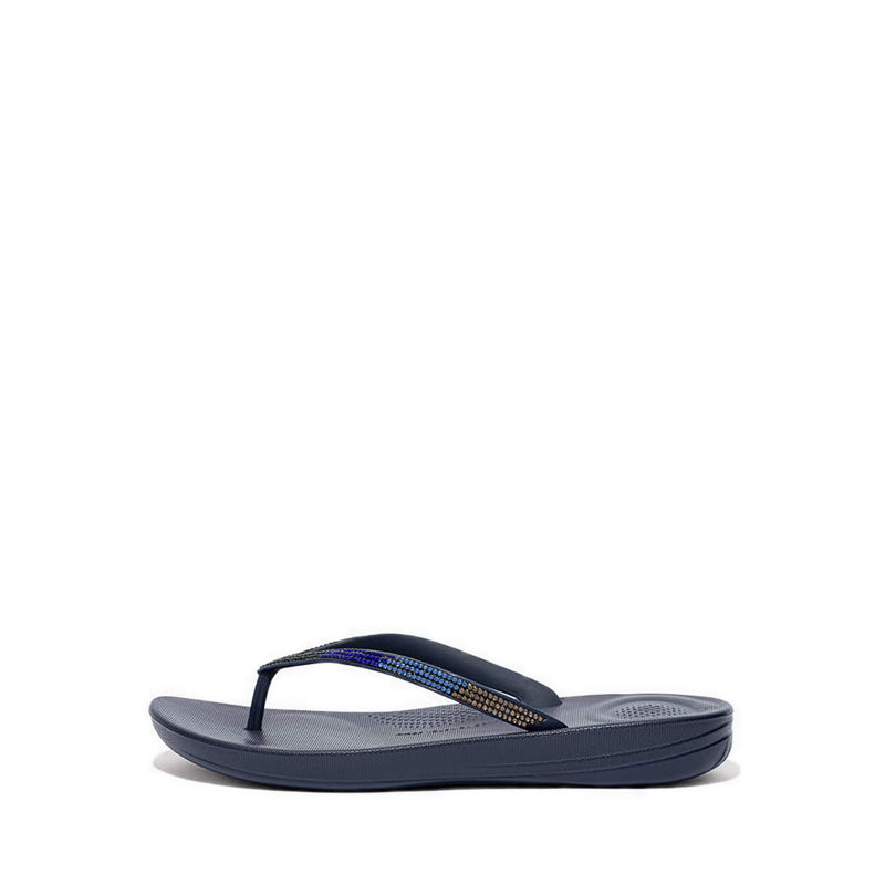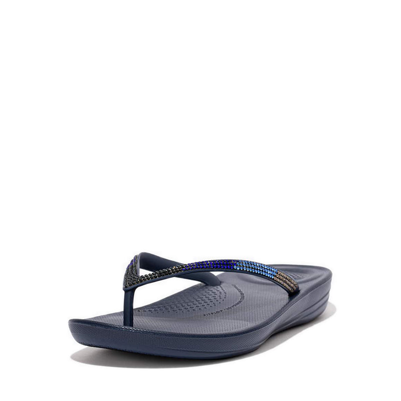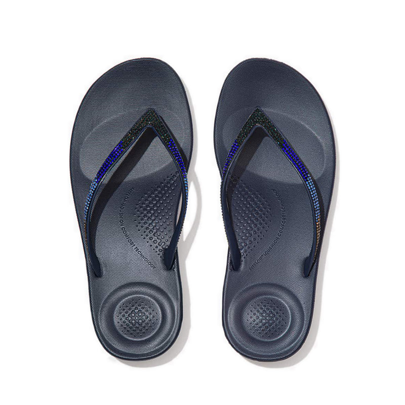From the top, they look like your typical surfer-girl flip-flops. Underneath, they’re biomechanically engineered with our iQushion™ midsole tech. Made of high-rebound air-foam for non-stop cushioning, with heel and ball-of-foot impact pillows, and a contoured arch-curve for natural support when you walk. This version adorned with shimmering micro-'crystals' in a pretty ombré design, throw these sparkle flip-flops in your suitcase and you’ll find yourself wearing them to beach, bar and beyond. Waterproof and slip-resistant.