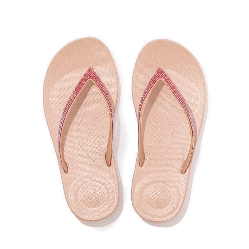 From the top, they look like your typical surfer-girl flip-flops. Underneath, they’re biomechanically engineered with our iQushion™ midsole tech. Made of high-rebound air-foam for non-stop cushioning, with heel and ball-of-foot impact pillows, and a contoured arch-curve for natural support when you walk. This version adorned with shimmering micro-'crystals' in a pretty ombré design, throw these sparkle flip-flops in your suitcase and you’ll find yourself wearing them to beach, bar and beyond. Waterproof and slip-resistant.