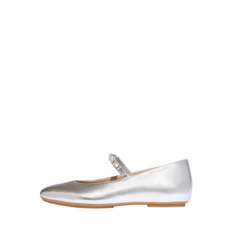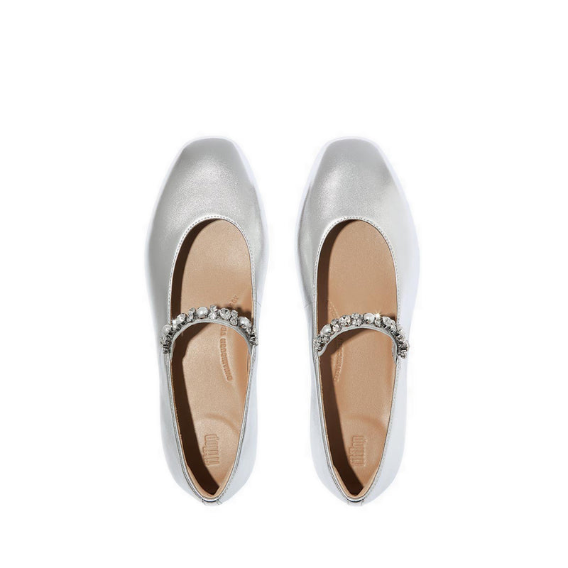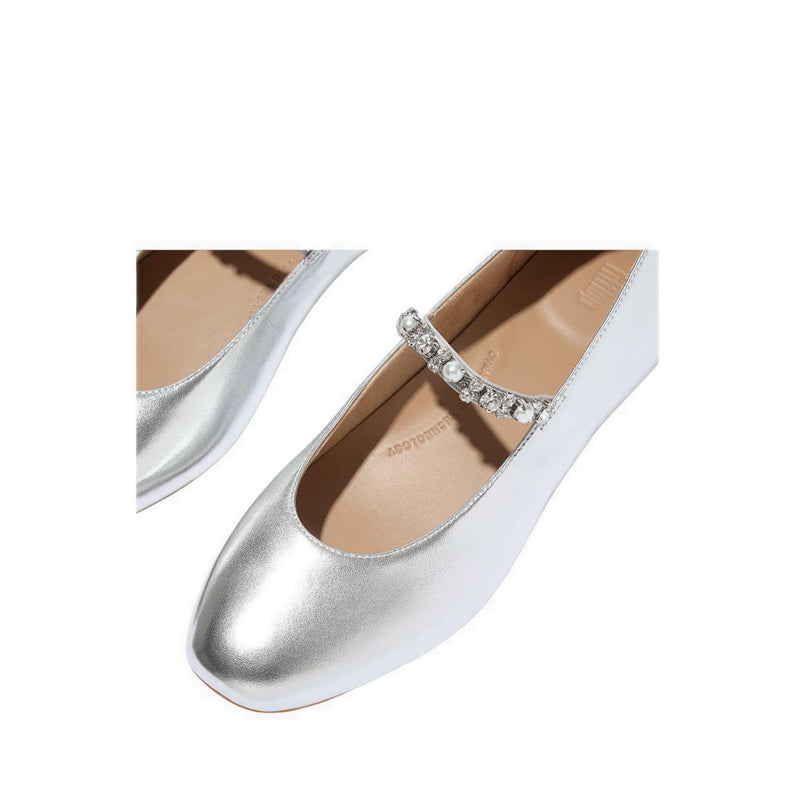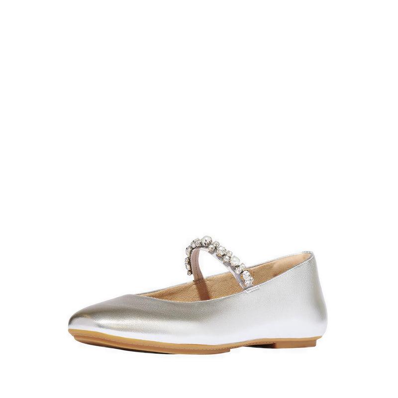 They’ve swapped out the style's rounded toe for a softly squared version for this pair, complete with a slender strap across the front to help hold your foot in place (and prevent your toes from bunching to keep them on). Sparkling faux-pearl and crystals clustered at the strap add even more glitz to the shimmering metallic finish of their buttery-soft leather silhouette.
