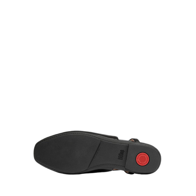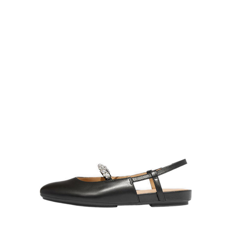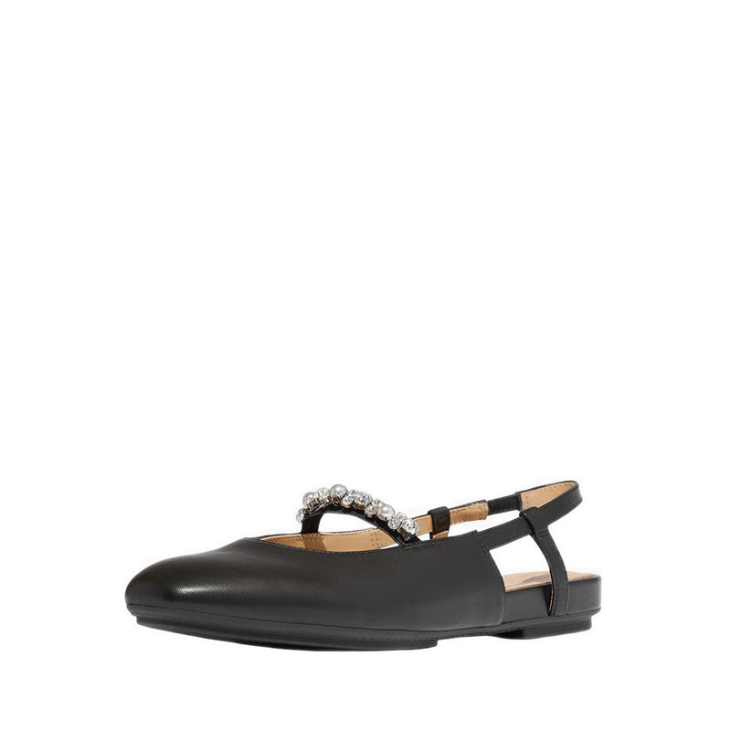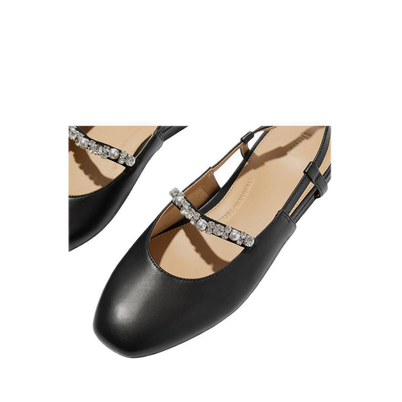 Powered by innovative Dynamicush™ technology that conceals high-rebound cushioning in a sleek, flat sole, this new iteration of FitFlop's much-loved Delicatos transforms the classic ballerinas into a summer-ready slingback. Crafted from smooth leather, the round-toe silhouette is secured by a stretchy strap around the back, with an additional front strap adorned with delicate gemstone embellishments.